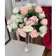 Aranjament floral rafinat, realizat din trandafiri in nuante de roz pal si crem, completati de hortensii albe si verdeata decorativa. Cu diametrul de 35/40 cm, acest aranjament este alegerea ideala pentru a decora mesele festive la nunti, botezuri sau alte evenimente speciale, oferind un efect elegant si romantic.