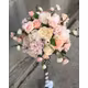 Aranjament floral delicat, cu diametrul de 25 cm, realizat in nuante suave de roz baby pink si crem. Mixul de trandafiri, bujori si flori de hortensie ofera un aspect romantic si rafinat, perfect pentru decoruri elegante.