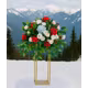 Aranjament floral mic, dar plin de eleganta, realizat din trandafiri rosii si crem, hortensii albe si frunze de ruscus, imbogatit cu accente verzi si florale discrete. Cu diametrul de 25 cm, este perfect pentru decorarea meselor de cocktail, a colturilor intime sau pentru evenimente unde se doreste un accent floral rafinat.