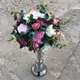 Un aranjament bogat realizat din flori artificiale in nuante diverse de roz, mov, alb si albastru petrol.
