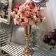 Un aranjament rafinat realizat din trandafiri si bujori artificiali in nuante calde de roz, somon si orange.