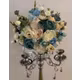 Un aranjament rafinat realizat din flori artificiale in nuante de alb, crem si turcoaz.
