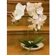 Un aranjament floral deosebit, realizat din orhidee din silicon alb, cu detalii fine galbene, care reda perfect prospetimea si frumusetea florilor naturale. Florile sunt dispuse pe doua tije elegante, completate de frunze verzi si radacini decorative, toate asezate intr-un ghiveci alb modern.