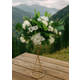 Aranjament floral delicat si elegant, realizat din trandafiri albi, flori decorative si verdeata luxurianta, dispuse armonios pentru un efect natural si proaspat. Tonurile luminoase de alb si verde aduc un plus de rafinament decorului.