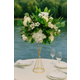 Aranjament floral rafinat, compus din trandafiri albi, flori decorative si verdeata luxurianta, aranjate cu grija pentru un aspect natural si elegant. Combinatia de tonuri verzi si albe aduce prospetime si armonie decorului.