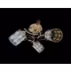 Realizată din metal finisat auriu, are trei abajururi din sticlă decorată în nuanțe de alb și maro deschis, cu model geometric modern.